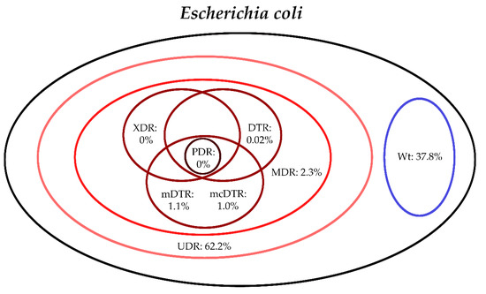 During data analysis, respective isolates were classified into various resistance categories. Isolates were considered Wt/susceptible if they were susceptible to all tested antibiotics, excluding those where intrinsic non-susceptibility is present. Isolates were classified in the usual drug resistance (UDR; defined by McDonell et al. [30]) category, if they were resistant to at least one tested antibiotic outside of their realm of intrinsic non-susceptibility. Classification of the isolates as multidrug resistant (MDR; defined as acquired non-susceptibility to at least one agent in three or more antimicrobial categories), extensively drug resistant (XDR; bacterial isolates remain susceptible to only one or two antibiotic categories) and pandrug-resistant (PDR; non-susceptibility to all agents in all antimicrobial categories) was based on the CDC/ECDC recommendations [23]. The designation of difficult-to-treat resistance (DTR; defined by Kadri et al. [24]) was used if an isolate showed resistance to carbapenems (imipenem, meropenem and ertapenem/doripenem), extended-spectrum cephalosporins (the ones relevant for respective pathogens) and fluoroquinolones (ciprofloxacin, levofloxacin and moxifloxacin) [24]. Modified difficult-to-treat resistance (mDTR; introduced in this study, relevant in all bacterial categories, except for P. aeruginosa) was used if an isolate showed resistance to extended-spectrum cephalosporins (the ones relevant for respective pathogens) and fluoroquinolones (ciprofloxacin, levofloxacin and moxifloxacin), fosfomycin (for Enterobacterales isolates) and sulfamethoxazole-trimethoprim (for Enterobacterales and Acinetobacter spp.). For E. coli only, an additional category (mcDTR; modified difficult-to-treat resistance in E. coli) was also introduced, which includes susceptibility data for nitrofurantoin as well.