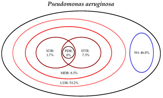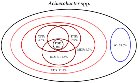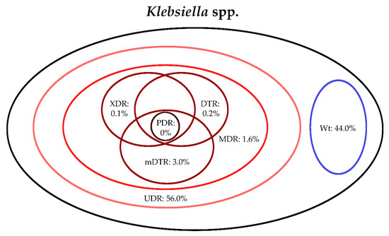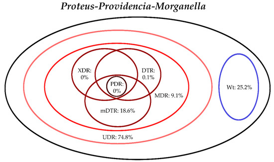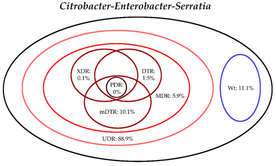 Antimicrobial susceptibility testing for the relevant Gram-negative bacterial isolates were performed based on the methodological recommendations and standards of the European Committee on Antimicrobial Susceptibility Testing (EUCAST) valid at the time of the interpretation; the Kirby–Bauer disk diffusion method (Liofilchem, Abruzzo, Italy), and E-test strips (in case of fosfomycin susceptibility testing; Liofilchem, Abruzzo, Italy) on Mueller–Hinton agar (MHA) plates, in addition, broth microdilution in a cation-adjusted Mueller–Hinton broth (in case of colistin susceptibility testing; MERLIN Diagnostik) was also used. For the verification of discrepant results, the VITEK 2 Compact ID/AST (bioMérieux, Marcy-l’Étoile, France) was used. Susceptibility testing included all relevant antibiotics for the respective bacteria, to allow for their classification into resistance categories based on the criteria detailed in Section 2.4; an antibiotic was not tested and was excluded from the analysis if intrinsic resistance was present, based on the EUCAST Expert Rules on Intrinsic Resistance and Exceptional Phenotypes [43]. To allow for easier data analysis, the bacterial isolates were grouped in six separate groups as follows, based on their similarities in intrinsic resistance: E. coli, Klebsiella spp., Citrobacter-Enterobacter-Serratia spp., Proteus-Providencia-Morganella spp., Pseudomonas aeruginosa and Acinetobacter spp., respectively [20,38,39,40,41]. The interpretation of susceptibility results was performed based on EUCAST breakpoints valid at the time of the interpretation. Intermediate results were grouped with and reported as resistant. The following strains were used as quality control (QC): S. aureus ATCC 29213, E. faecalis ATCC 29212, P. mirabilis ATCC 35659, E. coli ATCC 25922, P. aeruginosa ATCC 27853, A. baumannii ATCC 19606 and S. maltophilia ATCC 13637.