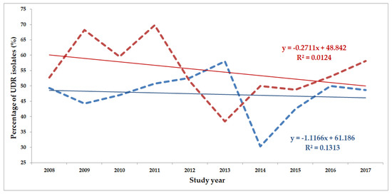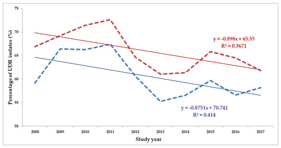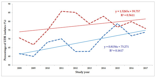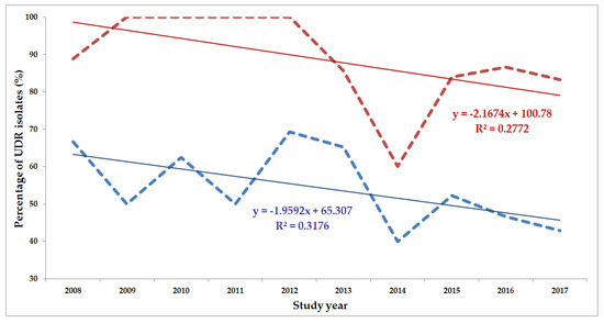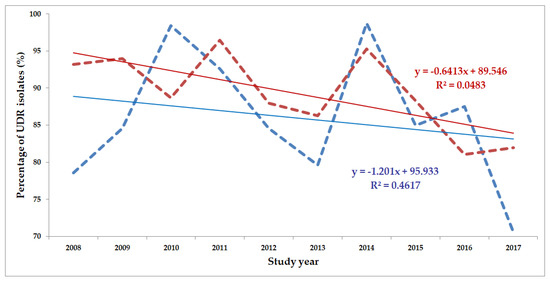 Statistical analyses, including the descriptive analysis and statistical tests (Student’s t-test and Mann–Whitney U test) were performed with the SPSS software version 24 (IBM SPSS Statistics for Windows 24.0, IBM Corp., Armonk, NY, USA). The normality of variables was tested using Shapiro–Wilk tests. A correlation analysis was also performed with the aim of assessing the temporal nature of changes in the ratio of UDR isolates during the study period; the coefficient of determination (R2) was also calculated. These analyses were performed using the Past 3.16 statistical software (Paleontological Museum, University of Oslo; Oslo, Norway). p values <0.05 were considered statistically significant.