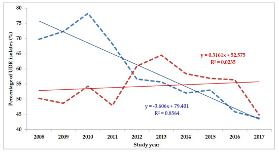 Changing trends of E. coli UDR isolates over the 10-year study period (2008–2017). Blue dashed line indicates isolates from outpatients, while red dashed line isolates from inpatients; R2: coefficient of determination; R2outpatients: 0.3671 (36.71%; not significant), R2inpatients: 0.414 (41.40%; p = 0.049).