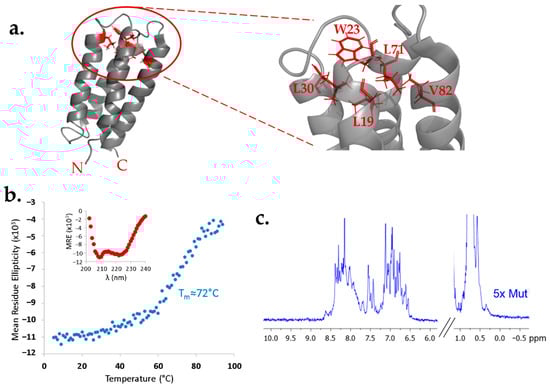 To test whether the structure of protein S-824 can tolerate a buried cavity, we replaced five buried side chains near the “top” of the bundle with five alanines. In this 5x-Ala mutant, five large hydrophobic side chains (Leu19, Trp23, Leu30, Leu71, Val82) were simultaneously reduced to single methyl groups (Figure 1a). The 5-fold mutated protein was compared to protein S-824 by circular dichroism (CD) and nuclear magnetic resonance (NMR) spectroscopy (Figure 1b,c). The CD spectrum of 5x-Ala (Figure 1b; inset) shows an α-helical secondary structure. Thermal denaturation of the mutant protein revealed that, although the melting point was somewhat reduced relative to the parental S-824 protein, 5x-Ala is very stable, with a Tm close to 72 °C.