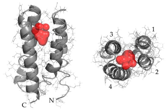 Removal of hydrophobic sidechains from the buried core of S-824 results in an apparent cavity. The sequence of 5x-Ala (L19A, L30A, W23A, L71A, V82A) was submitted to I-TASSER for structure prediction, excluding templates derived from binary patterned libraries. The top model for 5x-Ala (gray) was analyzed in PyMol and a cavity (red) was detected. Depicted here are the side view (left) with N- and C- termini labeled and the top view (right) with helices labeled 1 through 4.
