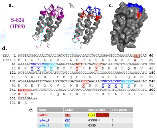 Design of a combinatorial library templated on protein S-824. (a) NMR structure of S-824. Purple: proposed variable region; Gray: invariant region. N- and C-termini labeled. (b) Specifics of library design. Red: catalytic/core residues (CatCor) encoded by NDT codon; blue: loop-forming regions (LpFor) encoded by VRC codon. (c) Surface view. CatCor residues are mostly buried hydrophobic residues while LpFor are surface-exposed residues found in the loops. (d) DNA and protein sequence of the novel genes. A mixture of amino acids is designated by X. (e) Degenerate codon and amino acids selected for each variable position. For CatCor, hydrophobic residues are highlighted in yellow and polar residues are highlighted in red.