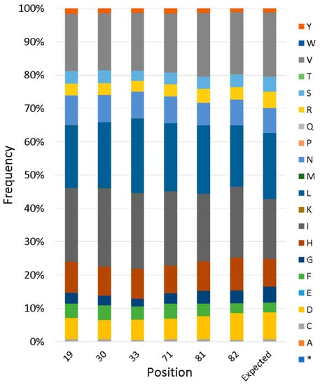 The quality and diversity of the library was assessed by high-throughput sequencing (Genomics Core Facility, Lewis-Sigler Institute for Integrative Genomics, Princeton University). Briefly, PCR was performed on plasmid DNA to generate amplicons for sequencing (MiSeq Micro, read length 300 nt). The chosen amplicon covered all the variable regions to retain information for complete individual sequences. These data were translated to the corresponding amino acids and analyzed in depth for each of the variable positions, and a constant position as a control. From these data, the percent occurrence of each amino acid at a particular position was determined.