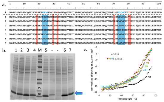 Randomly picked library members agree with design, express well, and are α-helical. (a) Sequence alignment demonstrating diversity of mutated sites. First line: Amino acid sequence of S-824, the parental protein for library generation. Positions subjected to semi-randomization are in red (CatCor) and blue (LpFor). Below are seven well-expressed sequences from the library with variable regions highlighted. (b) The majority of arbitrarily chosen library members express well. Library DNA was transformed into BL21 (DE3) E. coli and nine colonies were picked from the resulting plate for small-scale overexpression studies. Total protein content was assessed by SDS-PAGE. M: molecular weight marker with relevant values (kDa) listed above the bands, Precision Plus Protein™ All Blue Protein Standards (Bio-Rad); 1–7: library proteins yielding good expression; (-): off-library sequences yielding reduced or no protein of the expected size. Blue arrow indicates expected molecular weight of library proteins. (c) Thermal denaturation of S-824 and randomly chosen library proteins. The library proteins (colored circles) undergo cooperative denaturation with midpoints ranging from 72 °C to 78 °C (listed beside the curves). This is a slight reduction in Tm relative to the parental S-824 (black diamonds).