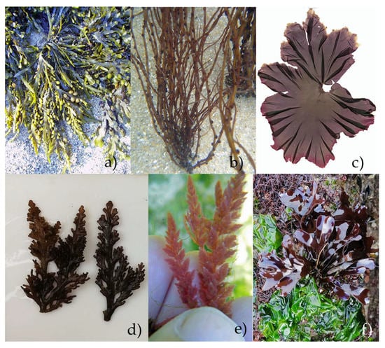 Previous studies reported MAAs’ presence in red seaweeds (Rhodophyta), namely Chondrus crispus (Figure 1f), Palmaria palmata, Gelidium spp., Pyropia spp. (formerly known as Porphyra spp.), Crassiphycus corneus (formerly known as Gracilaria cornea), Asparagopsis armata, Solieria chordalis, Grateloupia lanceola, and Curdiea racovitzae [,,].