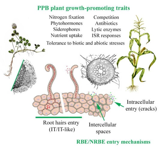 - Compant, S.; Clément, C.; Sessitsch, A. Plant growth-promoting bacteria in the rhizo-and endosphere of plants: Their role, colonization, mechanisms involved and prospects for utilization. Soil Biol. Biochem. 2010, 42, 669–678. [Google Scholar] [CrossRef]