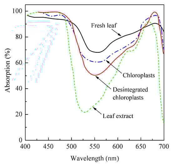 Absorption spectra of spinach leaves, isolated chloroplasts, and pigment extracts containing equivalent quantities of chlorophyll. Redrawn from [31].