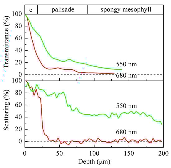 Representative distribution of transmitted (upper plot) and scattered (lower plot) light across Medicago sativa leaf. ‘e’ designates the epidermal layer. Redrawn from [37].