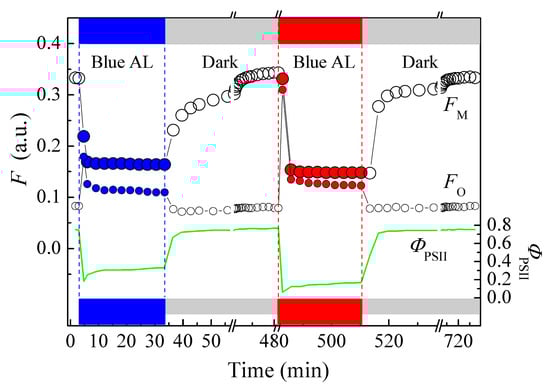 The time course of saturating pulse-activated (FM) and transient chlorophyll fluorescence (FO) at blue or red actinic light of moderate irradiance (155 μmol photons m−2s−1) and photosystem II efficiency (ΦPSII) in T. fluminensis leaves [71].