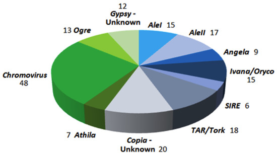 - Neumann, P.; Novák, P.; Hoštáková, N.; Macas, J. Systematic survey of plant LTR retrotransposons elucidates phylogenetic relationships of their polyprotein domains and provides a reference for element classification. Mobile DNA 2019, 10, 1. [Google Scholar] [CrossRef]