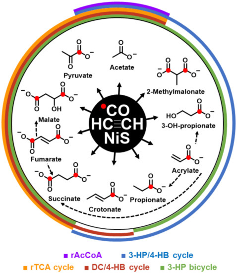 Concerning the question of the experimental interconversion of cycle constituents [22,23,24], we performed experiments with the replacement of acetylene by acrylate, fumarate, malate, and succinate as starting materials under otherwise identical conditions. The reaction products of fumarate were succinate, malate and maleate. Acrylate reacted to propionate, β-lactate, succinate, fumarate, and malate. Malate formed maleate, succinate, and fumarate. Succinate remained mainly unchanged and showed only minor conversion to fumarate and malate (Table 3).
