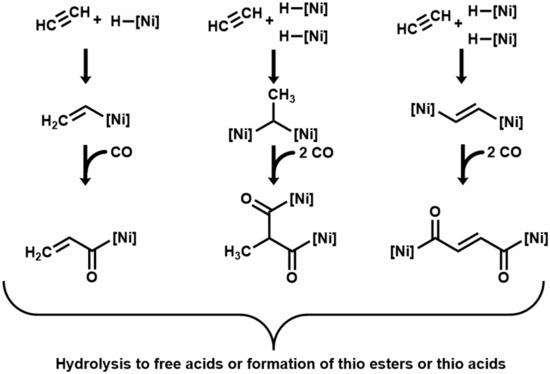 As initial interaction in the here-investigated acetylene/CO/NiS system, we suggest the coordination of acetylene and CO as ligands to Ni centers. The oxidation of the CO ligand to CO2 would generate hydride ligands. As next stages, we propose end-on organo–metal adducts between acetylene and one or two Ni centers, hydride transfer, and carbonyl insertion to form highly energetic acyl-[Ni] intermediates [35], which may hydrolyze to carboxylic acids with a total loss of the organo–metal energy. Instead of hydrolysis to free acids, they may react with a mercaptan (or H2S) to form thioesters (or thioacids) with partial energy conservation (Figure 2). The unsaturated carboxylates (acrylate and fumarate) that result from hydrolysis may subsequently convert by hydrogenation with CO as reductant to propionate and succinate. The addition of H2O may lead to the formation of lactate and malate.