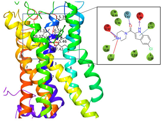 The homology model of H4R with docked JNJ7777120 antagonist. The specific ligand–receptor interactions are shown on the right panel. D3.32 forms both a hydrogen bond and an ionic interaction with the charged amine group of the ligand.
