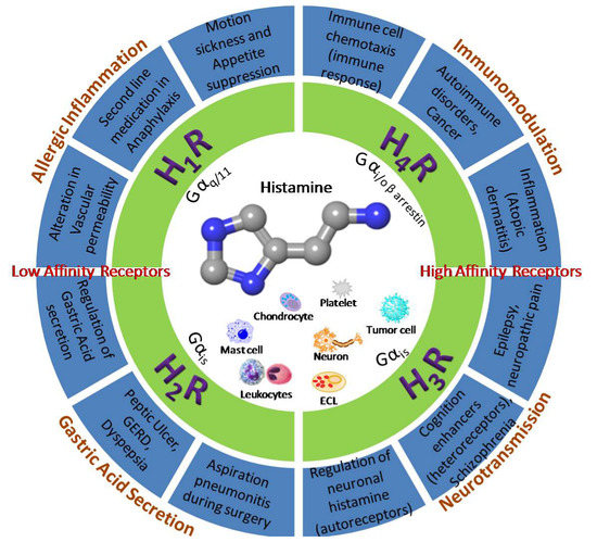 A plethora of studies have related the heterogenic and complex pharmacology of histamine receptors to various diseases: H1R to the allergic inflammation, anaphylaxis, and motion sickness [28,29], H2R to the stimulation of gastric acid secretion leading to peptic ulcer, GERD and aspiration pneumonitis [30,31], H3R to the neurotransmission controlling sleep, cognitive processes, schizophrenia, epilepsy, and pain [32,33,34,35,36,37], and H4R to the immune responses (cancers, myocarditis) and inflammation [38,39,40,41,42] (Figure 2). The H3 and H4 receptors have relatively high affinity for histamine (5–10 nM) compared to the low affinity of H1R and H2R which is in the μM range [6,43]. Hence, the biological response has been linked directly with the local tissue histamine concentration and functional expression of different receptors [6].