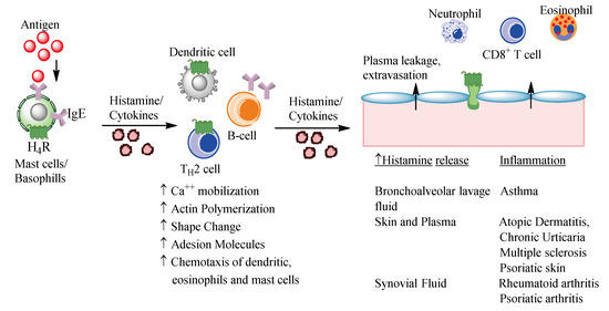 Potential role of histamine and histamine H4R-induced recruitment of eosinophils and mast cells in chronic allergic inflammation. Histamine has been known to be a major mediator of inflammation. Histamine H4 receptors are expressed on the surface of both eosinophils and mast cells. Allergen may crosslink immunoglobulin E (IgE) on mast cells to release histamine, lipid mediators, and cytokines. Antigen is also processed by dendritic cells and macrophages for presentation to T-helper cells. During this process a local release of histamine and cytokines may occur. Histamine can act on a variety of cells and at different levels. In asthma histamine can facilitate the recruitment of inflammatory cells by regulating the chemotaxis of additional dendritic cells, eosinophils, and mast cells to the airways via the action at H4R. Histamine may additionally affect cytokine release from CD8+ cells via binding to H4R and from eosinophils, neutrophils, and mast cells through multiple histamine receptors.