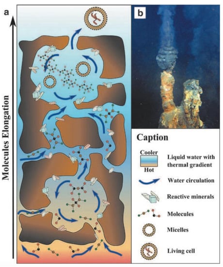 (a) An overview of the submarine hydrothermal vent origins of life hypothesis. The space and time gradients flow from bottom to top. Simple molecules such as carbon dioxide, hydrogen sulfide, and molecular hydrogen bind to pyrite and sphalerite and are assembled into larger monomers via condensation reactions within mineral gels. Circulation through pore openings select for the longest oligonucleotides. These are encapsulated into amphiphilic lipid membranes that self-assemble in basic solutions. As the protocells are transported vertically up the vent chimney, they are stressed by decreasing thermal energy and decreasing pH, which promote the development of increasingly resilient and robust populations. (b) Image of an oceanic hydrothermal vent (credit: NOAA). Adapted from Westall et al. [30]. Reproduced with permission from Mary Ann Liebert, Inc.; New Rochelle, NY.