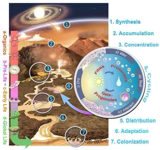 Although much of the past three decades of research on life’s origins has been focused on submarine hydrothermal vents, terrestrial hot springs have recently emerged as a plausible alternative. Mulkidjanian [48] speculated that cellular life may have begun in anoxic freshwater hot springs rather than in seawater, and that key chemical pathways to ribonucleotides could be facilitated by ultraviolet (UV) radiation exposure in a subaerial landscape. In recent years, Damer and Deamer have synthesized many previous findings with a model of combinatorial selection, which proposes an “end-to-end” pathway from simple, self-assembled protocells through an intermediate stage called the “progenote” to the emergence of the first primitive microbial communities [3,49]. The crux of the hot spring origins of life hypothesis is that cycles of hydration and dehydration in hydrothermal fields could synthesize biologically relevant polymers from monomers delivered to subaerial landscapes on the early Earth, and encapsulate those polymers into membrane-bounded compartments to form protocells. These protocells could act as natural experiments, and could be subjected to a form of combinatorial selection that amplifies populations of functional polymers encapsulated within increasingly robust protocells. According to the hot spring hypothesis, this selection represented the initial step toward Darwinian evolution that ultimately gave rise to much more complex, living cells (Figure 2).