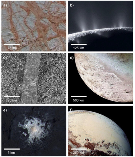 Distinctive features of moons and dwarf planets in the outer Solar System with potential subsurface oceans. (a) Europa: linear ridges are created as water upwells through tidal fractures in the moon’s icy crust. (b) Enceladus: geysers eject large quantities of saline water into space. (c) Ganymede: high-albedo, grooved regions have experienced recent tectonic activity. (d) Triton: dark deposits on the south polar cap are emplaced by eruptions of sublimating nitrogen ice. (e) Ceres: salt mounds form when water percolates to the surface and evaporates. (f) Pluto: Sputnik Planum, a basin filled with nitrogen ice, is aligned with the dwarf planet’s tidal axis. All images are credit of NASA.