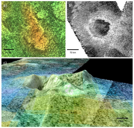 Potential sites for an origin of life on Titan. (a) Evaporites in Atacama Lacuna display a strong 5-micron absorption feature in a Cassini Visible/Near Infrared Mapping Spectrometer image. (b) Cassini radar image of Selk Crater, the landing site for the National Aeronautics and Space Administration’s (NASA) Dragonfly mission. (c) Cassini digital elevation model of Sotra Facula, a putative cryovolcano in Titan’s equatorial region. All images are credit of NASA.