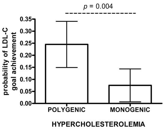 The estimated probability of achieving LDL-C targets in patients with monogenic hypercholesterolemia was significantly lower than for polygenic subjects in adjusted IPWRA analysis (0.075 vs. 0.245, p = 0.004) (Figure 2). Polygenic patients were more likely to achieve the LDL-C treatment goals when compared to monogenic patients (RR = 3.28; 95% CI: 1.23–8.72) (Table 3B). In a logistic regression model, individuals with a polygenic cause of hypercholesterolemia were more likely to achieve LDL-C goals than those with a monogenic cause (OR 3.56, 95% CI: 1.19–10.64). Additionally, a higher proportion of individuals without documented cardiovascular disease achieved LDL-C treatment goals (OR 11.49, 95% CI: 1.46–90.91) (Table 3B).