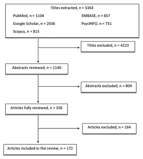 According to the Preferred Reporting Items for Systematic Reviews and Meta-Analyses (PRISMA) guidelines [34], the databases of PubMed, Scopus, Embase, PsycINFO, and Google Scholar were accessed in order to research and collect articles that were published only in the English language. Free text terms and MeSH headings were combined as follows: “(inflammation OR metabolic markers OR cytokines OR immune system) AND (mood disorders OR bipolar disorders OR depression)”. All of the authors agreed to include in the review conference abstracts, posters, and case reports if published in indexed journals. The following inclusion criteria were adopted: preclinical accurate studies carried out with standard/proven techniques and clinical studies carried out in children/adults with reliable diagnosis of mood disorders, according to structured interviews and standardized criteria and reliable assessment of outcome measures. All of the authors equally contributed to identifying potential information specific to this topic among the titles and abstracts of the publications. The first selection excluded 4223 titles because: a) they were duplicates; b) they did not concern the scope of the paper; c) they were not informative enough. The second selection excluded 804 abstracts after being read and reviewed, as the information reported did not fulfill the scope of our paper and/or the presented information did not seem relevant to the discussed topic. Subsequently, 144 more publications were excluded after being completely read and evaluated, as they did not provide enough information and/or result sufficiently in line with our review. Finally, 172 papers were included in the present review (Figure 1). The search was last updated in December 2019.