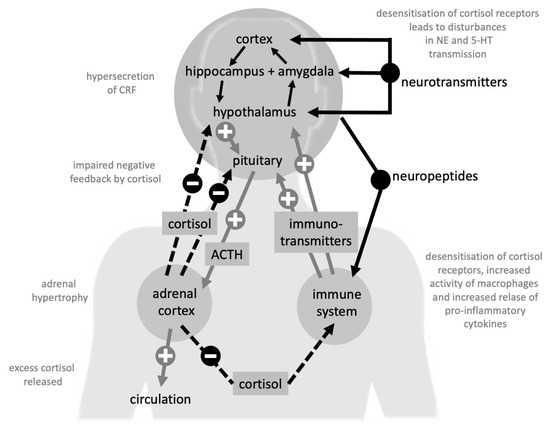 For a long time, HPA dysfunctions have been considered one of the most relevant factors underlying the onset of depression, although their precise mechanisms have not yet been fully elucidated [92,93,94]. In the central nervous system, glucocorticoids participate in the regulation of neuronal survival and neurogenesis, especially at the level of hippocampus, as well as to the modulation of memory processes and emotional learning [95], in addition to regulating, through negative feedback, on limbic and hypothalamic areas, the release of corticotropin-releasing factor (CRF). At the peripheral level, glucocorticoids act by modulating the immune and inflammatory response through specific receptors located on the membranes of lymphocytes and leukocytes [96]. The hypothalamus seems to be the brain area most involved in the inflammation trigger after psychosocial stress [35]. In particular, psychosocial stressors can induce hypothalamic release of catecholamines and CRH that act on the HPA axis. At the level of the immune system, the catecholamines, by increasing NF-κB expression, trigger the production of inflammatory cytokines [30,35] that, in turn, after entering the brain, may cause the activation of microglia and consequent neuro-inflammation [32,35]. On the other hand, the release of CRH activates the HPA axis, followed, in physiological conditions, by the negative feedback on the release of CRH and the inhibition of inflammatory responses. In pathological conditions, as in the case of depression or chronic stress, the presence of a state of “glucocorticoid resistance”, possibly related to cytokines effects on glucocorticoid receptors, may lead to HPA axis hyper-activation and neuro-inflammation perpetuation [35]. Such phenomena would seem to provoke detrimental effects on the brain structures, and may underlie the brain damage possibly associated with MDD and BDs, as they cause monoamine metabolism alterations, decreased neurotrophism, and excitotoxicity [9,10,35]. Different scholars reported increased cortisol levels in plasma, saliva, and urine of depressed patients, in some cases associated with an increased volume of pituitary and adrenal glands [97,98]. Mineralocorticoid receptors (MRs) may also play a role in HPA axis dysfunction in depression, such as the desensitization and loss of inhibition in HPA feedback [92]. The consequences of glucocorticoids imbalance and resistance would contribute to the continuous secretion of pro-inflammatory cytokines, also altering the hippocampal microglia functions [99]. The persistence of cytokine secretion, in turn, may lead to the activation of specific metabolic pathways, such as the shunt of TRP (also known as “kynurenine pathway”), with the production of QA stimulating the glutamatergic system and lowering 5-HT production [100,101]. In addition to inflammation and neurotransmitters, dysfunction of the HPA axis could negatively impact the production of neurotrophins and promote the oxidative stress [92,93,94].