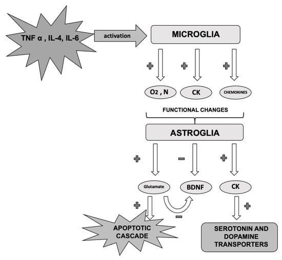 Finally, as outlined above, an increase in microglia affecting different brain regions was observed in depressed patients. It was also described that microglia could regulate the release of BDNF and reduce the expression of BDNF and its affinity with tyrosine receptor kinase B (TrkB) receptor [201]. Conversely, BDNF can promote glia growth and proliferation [217,218] and contribute to the chronic inflammatory state of the brain and neurotoxicity observed in several mood disorders [69,70,71].
