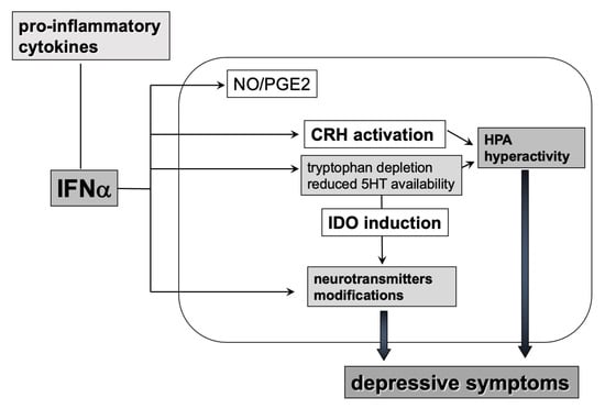 It is known that cytokines long-term exposure can trigger depressive episodes. Many patients undergoing immune-therapy with interferon-α (INF-α) developed depressive clinical pictures, especially considering the sub-threshold syndromes [61,62,63,64]. The administration of pro-inflammatory cytokines, such as IFNα or their inducers (specifically endotoxins or anti-typhoid vaccination) may precipitate depressive symptoms in healthy subjects [65,66,67]. Besides depressive moods, subjects exposed to endotoxin also showed feelings of social disconnection, and increased neural activity related to pain and threats in response to negative social experiences [68,69,70]. On the contrary, in depressed subjects suffering from other diseases, such as rheumatoid arthritis, psoriasis, and cancer, blockade of TNF-type cytokines or other inflammatory components (such as cyclo-oxygenase 2) significantly reduced depressive symptoms [71,72,73,74].