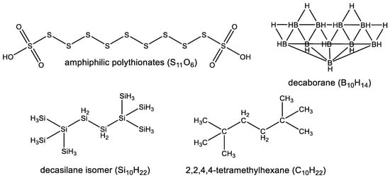 On Earth, carbon forms the major scaffold element (hence the term “carbon-based life”). Several other non-metal elements could be viable scaffold alternatives to carbon in that regard [1,2,3,4]. Sulfur, boron and, in particular, silicon, are capable of forming covalent compounds in which many atoms of the same type are bound together to form large molecules, and therefore could, in principle, be considered as “scaffolding elements” [10] (Figure 2). Sulfur-based polymers, e.g., amphiphilic polythionates [11], are, however, limited to linear chains, which severely restricts the diversity of possible shapes in sulfur-based systems. Boron, on the other hand, forms polymeric structures that are clusters of atoms rather than smaller, isolated molecules, e.g., decaborane (14), B10H14, which, while stoichiometrically a boron analogue of the hydrocarbon decane, is in structure more similar to a diamond nanoparticle [12]. Among these alternatives, silicon seems to be the most promising choice as a substituent for carbon in biochemistry (Figure 2).
