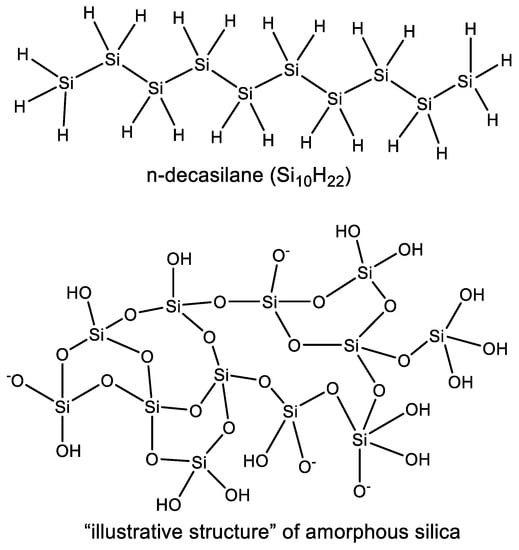 Polymerization of silicon in oxygen-rich aqueous environments leads to a meshwork of Si–O chains (e.g., “illustrative structure” of amorphous silica) and not linear polymers like silanes (e.g., n-decasilane (Si10H22)). As a result, Si chemistry in oxygen-rich environments (e.g., water) ultimately leads to silica (SiO2), a refractory solid.
