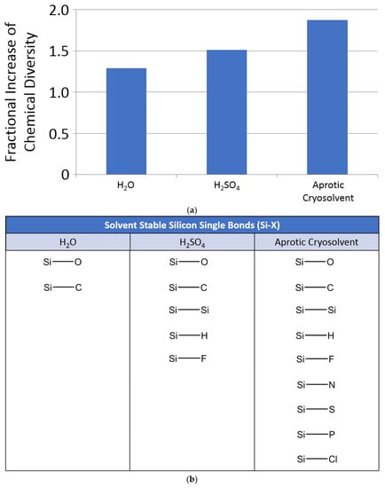 Theoretical chemical diversity of silicon chemistry. (a) Relative size of the chemical space with silicon included in SPONCH + F + Cl chemistry, compared to the chemical space without silicon. Y axis: size of the chemical space of chemical structures with up to six non-hydrogen atoms predicted to be stable in respective solvents generated by including silicon chemistry. The relative size of the chemical space is calculated as S/N, where S is the number of molecules in the chemical space with silicon and N is the number without silicon. See main text and Appendix E.1 for details. (b) Silicon single bonds generally stable in H2O, H2SO4 and aprotic cryosolvent (a qualitative assessment, based on the chemical reactivity of silicon compounds discussed in detail in Section 4). Very few Si-containing chemical bonds are stable in water. Note that, while some Si–O bonds are generally stable to hydrolysis in water (e.g., in the context of C–Si bonds, like C–Si–OH), many Si–O-bond-containing functional groups are not (e.g., O–Si–O–C), further limiting the scope of Si chemistry available for life in water. Sulfuric acid can support larger number of Si-containing bonds, and, as a consequence, more diverse silicon chemistry. Virtually all chemistry is stable in aprotic cryosolvents.