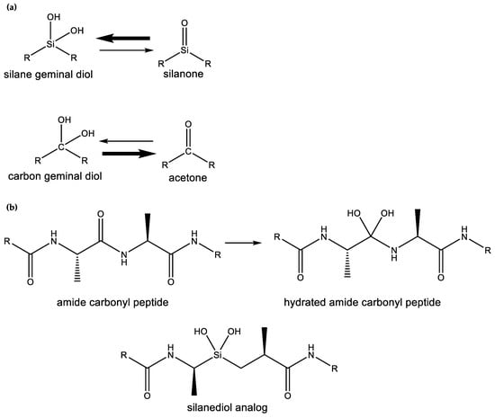 Silanols, silanediols, and silatriols (13, 14, 15) are silicon-containing analogues of alcohols that are characterized by unusual solubility properties, often being similarly soluble both in water and other solvents, like hexane [89,90,91,92]. Such solubility behavior is likely the result of the formation of strong hydrogen-bonded molecular complexes in solution [69,93,94]. Such enhanced hydrogen-bonding abilities and increased acidity of silanols, relative to carbon analogues, have potentially useful biological applications that their carbon analogues cannot provide (Figure 6). For example, silanediols are present almost exclusively as the geminal diol tautomer over silanone (i.e., Si=O). Silanediols mimic the geminal diol form of carbonyl as a transition state analogue in the catalytic cycle of proteases; they are therefore considered potent protease inhibitors [57,95,96,97,98,99]. This characteristic of silicon organic chemistry could be potentially explored for a useful biological function by water-based terrestrial life.