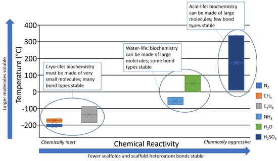 Although water is a good solvent for Earth’s carbon-based life, many other solvents have been proposed as well suited for alternative biochemistries (e.g., sulfuric acid, carbon dioxide, hydrogen cyanide, propane, ammonia, hydrogen sulfide, ethane and methane, nitrogen, and even neon and argon) [1,3,4,19,20,21,22]. These liquids broadly fall into the protic solvents (solvents that, like water, can donate or accept protons from chemicals dissolved in them, such as H2SO4, H2S, NH3), and aprotic solvents (such as liquid hydrocarbons or nitrogen). In general, protic solvents are chemically aggressive, and their aggressiveness limits the chemistry that can stably dissolve in them. In contrast to protic solvents, aprotic solvents are generally less reactive and stably dissolve a wider range of chemicals than protic solvents.