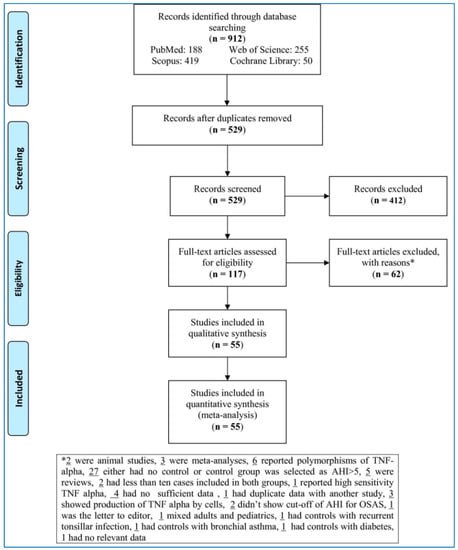 The flow chart (Figure 1) sets out the selection process. The search databases yielded 912 articles; of these, 117 full-texts met eligibility criteria after removing duplicates and irrelevant studies. Next, 62 articles were removed with reasons (two were animal studies, three were meta-analyses, six reported polymorphisms of TNF-alpha, twenty-seven either had no control or control group was selected as AHI > 5, five were reviews, two had less than ten cases included in both groups, one reported high sensitivity TNF alpha, four had no sufficient data, one had duplicate data with another study, three showed production of TNF alpha by cells, two did not show cut-off of AHI for OSAS, one was the letter to editor, one mixed adults and pediatric samples, one had controls with recurrent tonsillar infection, one had controls with bronchial asthma, one had controls with diabetes, one had no relevant data). This left 55 studies to be analyzed in the meta-analysis [14,16,28,29,30,31,32,33,34,35,36,37,38,39,40,41,42,43,44,45,46,47,48,49,50,51,52,53,54,55,56,57,58,59,60,61,62,63,64,65,66,67,68,69,70,71,72,73,74,75,76,77,78,79,80].
