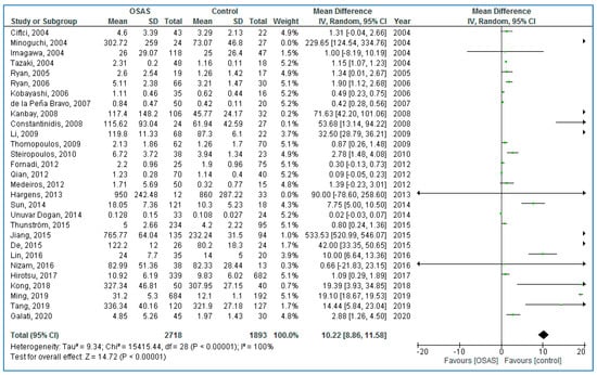 Twenty-nine studies compared serum TNF-α concentrations between adults with OSAS and healthy controls (Figure 2); adults with OSAS had significantly higher TNF-α concentrations compared to healthy controls: 10.22 pg/mL (95% CI = 8.86, 11.58; p < 0.00001; I2 = 100% (Ph or Pheterogeneity < 0.00001)).