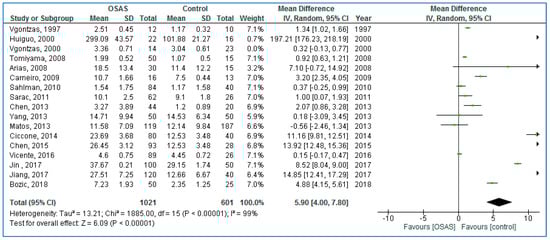 Seventeen studies compared plasma TNF-α concentrations between adults with OSAS and healthy controls (Figure 3) and found significantly higher TNF-α concentrations in those with OSAS: 5.90 pg/mL (95% CI = 4.00, 7.80; p < 0.00001; I2 = 99% (Ph < 0.00001)).