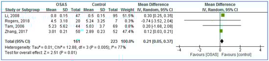 Four studies compared serum TNF-α concentrations between children with OSAS and without OSAS (Figure 4) and found significantly higher TNF-α concentrations in those with OSAS: 0.21 pg/mL (95% CI = 0.05, 0.37; p = 0.01; I2 = 77% [Ph = 0.005].