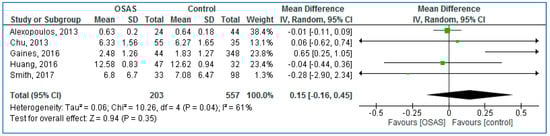 Five studies compared serum TNF-α concentrations between children with OSAS and without OSAS (Figure 5) and found no statistically significant MDs: 0.15 pg/mL (95% CI = −0.16, 0.45; p = 0.35; I2 = 61% [Ph = 0.04]).