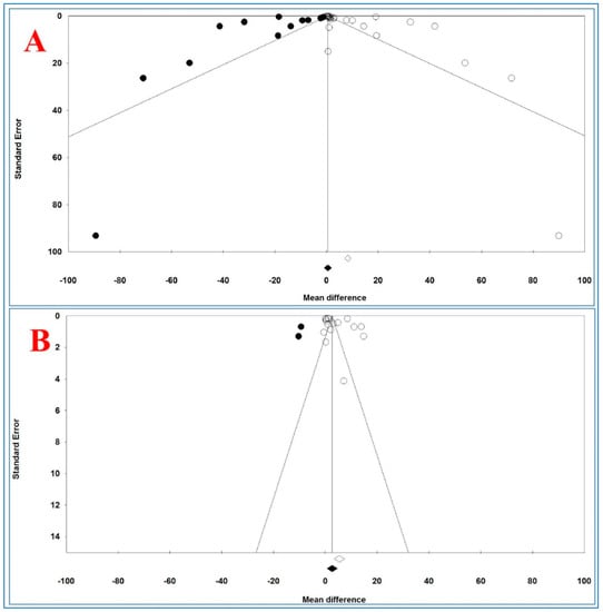 - Duval, S.; Tweedie, R.L. Trim and fill: A simple funnel-plot-based method of testing and adjusting for publication bias in meta-analysis. Biometrics 2000, 56, 455–463. [Google Scholar] [CrossRef] [PubMed]