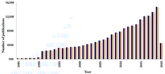 Fungi produce a large diversity of secondary metabolites (hereafter referred as specialized metabolites), from which more than 15,600 are unique to them []. The production of specialized metabolites by fungi is an evolutionary advantage, as they use metabolites to defend themselves, takedown defenses, as well as to takedown defenses of their potential food sources, and for intra-/interspecific chemical communication [,,,]. For example, fungi communicate and interact within and with other species either via volatile organic compounds (VOCs) or non-volatile secreted compounds [,]. Most of these compounds have been identified using mass spectrometry (hereafter MS). Therefore, MS is a powerful tool in understanding fungi metabolism. Fungal metabolites are being continuously discovered and the rate of these discoveries has been accelerated significantly during the last two decades. This is thanks to the development of MS, which has been used in mycological studies such as biotyping, ecology and monitoring the production of predominantly specialized metabolites. Indeed, in a search within the Web of Science portal, we found that the number and pattern of scientific publications per year involving fungal metabolites are almost identical to the number and pattern of mycological studies involving MS techniques (Figure 1). The development of MS instruments and techniques during the last three decades has also stimulated the increasing number of publications related to fungal metabolites, which heavily increased from around 750 released publications in 1985 up to around 16,000 in 2019 (Figure 1).