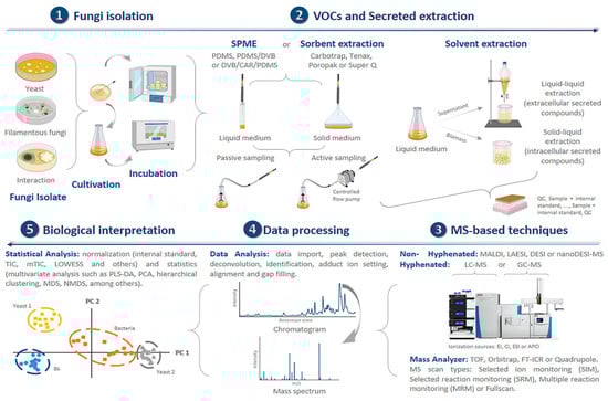 Sampling strategies in metabolomics and the minimization of unwanted sources of variation are highly important. The source of variation can be broadly summarized as: (i) sample collection (including environmental factors) and culture conditions, (ii) metabolite extraction or sample pre-treatment prior to analysis, (iii) parameters of the MS-based instrument and (iv) data processing and compound identification [,,]. The omission or minimization of such unwanted variation can have negative impacts on the development of the study, resulting in, for example, ambiguous identification or the identification of fewer biomarkers if we use non-hyphenated MS, i.e., MS that is not coupled to an orthogonal separation system [,,]. In Figure 2, we summarize the steps involved in metabolomic studies from the preparation of the fungi material through to sampling and MS analysis to data processing and interpretation.