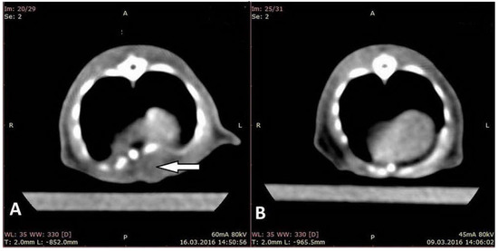 On the CT-scan performed on the 7th day of the experiment (CT2), we observed a marked depression of the lower sternum in all rats from the EG (Figure 2). This deformation of the sternum remained present in the EG throughout the entire period of the experiment, in each CT examination (CT2–5).