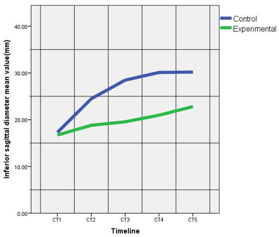 There were no statistically significant differences between the two groups for AD all through the experiment CT1–5 (p > 0.05) (Table 1). SSD was similar from CT1 to CT4 (p > 0.05). At CT5, SSD was higher in the EG (p = 0.01). SD4 was similar between groups, except CT3 where it was higher for the CG (p = 0.02). Significant differences were noticed for the ISD measured on the CT2, CT3, CT4 and CT5, ISD for the EG was significantly smaller than in the CG (Figure 3). There were no significant statistical differences between the transverse diameters of the EG and the CG, except for STD at CT 2 (EG > CG, p = 0.01) and ITD at CT4 (CG > EG, p = 0.01).