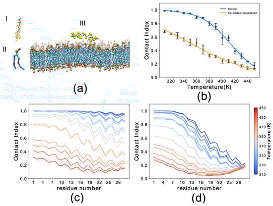 Simulation setup and contact index comparison between the helical and extended-disordered conformations. (a) Representative setup of the simulations. (I) αS1–30 molecule in the Martini 3 force field in helical conformation. Backbone and side chain particles are shown in pink and yellow, respectively. (II) Representative lipid molecule (DOPE). The phosphate group is shown in orange. (III) Lipid bilayer (DOPE, DOPS and DOPC in a 5:3:2 w/w ratio) and an αS1–30 molecule in helical conformation. (b) Membrane-binding melting curves showing the global contact index as a function of the temperature of the simulation. Blue and orange lines report the melting curves of αS1–30 binding to DOPE:DOPS:DOPC lipid bilayer, with the protein in helical and extended-disordered conformations, respectively. Error bars report the standard deviation between three segments of the simulation. (c,d) Residue specific contact indexes in temperatures ranging from 310 K (dark blue) to 450 K (dark red), with a step increment of 10 K. Contact indexes for αS1–30 binding to DOPE:DOPS:DOPC lipid bilayer in helical (c) and extended-disordered (d) conformations.