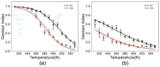 Membrane binding melting curves of binding to DOPE:DOPS:DOPC lipid bilayers by WT and F4A αS1–30. The curves illustrate the dependency of the global contact index as a function of the temperature of the simulation. Data for WT and F4A αS1–30 are shown in black and red, respectively. Panels (a,b) report data for αS1–30 in helical and extended conformation, respectively. Error bars report the standard deviation between three segments of the simulation.