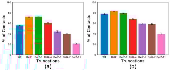 Global contact indexes were calculated by using a window of 15 residues starting at the first amino acid of each construct. The resulting melting curves (Figure S3) were further condensed into a temperature-averaged global contact index (TAGCI) to provide a direct comparison between the membrane affinities of different αS constructs using a single value. TAGCI values of helical (Figure 3a) and extended conformations (Figure 3b) of the αS constructs featuring different levels of N-terminal truncation were in excellent agreement with experimental data [51]. The results indicate that the helical conformation maintains a higher membrane-binding affinity across all the constructs with respect to the extended-disordered state. Some sequence-specific patterns in the binding affinities of the truncated constructs were also observed. In particular, the deletion of residues Asp 2 and Val 3 from the sequence (Del-2 and Del-2-3) induced stronger membrane binding, as also observed experimentally [51]. This observation is likely associated with the removal of a negatively charged residue from the sequence. This effect was more prominent for the extended-disordered conformations, suggesting a negative regulation by Asp 2 of the tethering of αS to acidic membranes. Larger truncations generated a decrease in the binding affinity of αS in both helical and extended-disordered conformations, with the strongest effects found in the construct Del-2-11, which is in line with the experimental data [51]. Taken together, the data in the literature [50,51] and the present simulations highlight the key role of the first 11 residues of αS in the membrane binding of αS. In addition, the correlated patterns in helical (Figure 3a) and extended-disordered (Figure 3b) conformations indicate that the effects of the truncations are conformationally independent, thereby highlighting the intrinsic role of the sequence properties of αS1–30 in the membrane binding. The intrinsic role of the N-terminal sequence is further corroborated by control simulations of the region spanning the last 30 residues of αS (αS111–140), indicating a significant difference in the binding properties of αS1–30 and αS111–140. In particular, αS111–140 showed essentially no membrane affinity and a negligible conformational effect when comparing helical versus extended-disordered conformations (Figure 4).