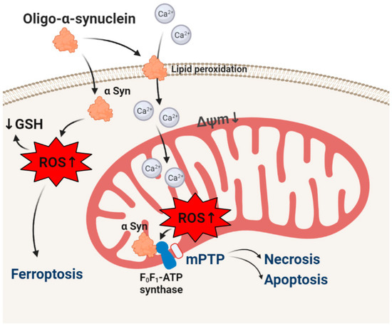 - Angelova, P.R.; Ludtmann, M.H.R.; Horrocks, M.H.; Negoda, A.; Cremades, N.; Klenerman, D.; Dobson, C.M.; Wood, N.W.; Pavlov, E.V.; Gandhi, S.; et al. Ca2+ Is a Key Factor in α-Synuclein-Induced Neurotoxicity. J. Cell Sci. 2016, 129, 1792–1801. [Google Scholar] [CrossRef]