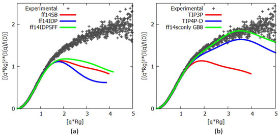 Kratky plots comparing the experimental small-angle X-ray scattering (SAXS) data (in gray) to representative structures obtained from each of the (a) simulated force field conditions: ff14SB and the modified ff14IDPs and ff14IDPSFF force fields and (b) solvation conditions: TIP3P, TIP4P-D and the implicit solvent GB8.
