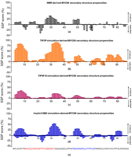 Comparison of (a) NMR-determined transient secondary structure propensities of c-MYC1-88 with (b) those obtained from the molecular dynamics simulations using the TIP3P solvation method, (c) those obtained from simulations using the TIP4P-D water model and (d) those obtained from the simulations using the implicit generalized Born (GB8) solvation method. The positive values on the Y-axis correspond to regions with a tendency to form α-helices, whilst the negative Y-axis values reflect regions with propensities towards extended structure formation. (e) Sequence of c-MYC1-88 with MYC-boxes MB-0 colored in red and MB-1 in blue.